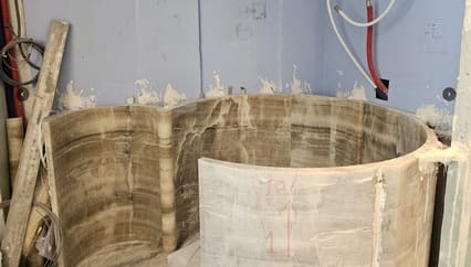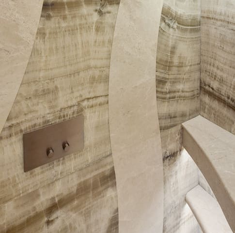 Les matériaux jouent un rôle central dans la perception de l’espace : pierres naturelles, ébrasements en marbre, sols en marbre aux joints d’une extrême précision, boiseries et agencements en panneaux marquetés. La baignoire et certaines douches ont été taillées dans la masse, intégrant des éléments translucides rétroéclairés. L’ensemble des agencements a été réalisé sur mesure, jusqu’à une cuisine toute intégrée, où les murs en bois dissimulent l’ensemble de l’électroménager et des rangements.